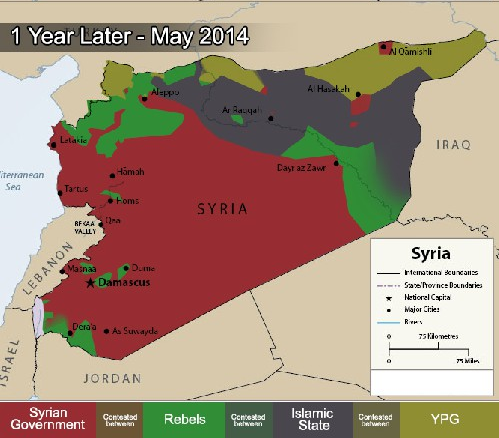 Bugünkü manzarada IŞİD faktörünün Suriye’deki iç savaşta ne denli etkin olduğu açıkça belli oluyor. Suriye’nin kuzeyinde koyu renklerle işaret edilmiş alanlar, IŞİD’ın hakimiyet ilan ettiği bölgeler.